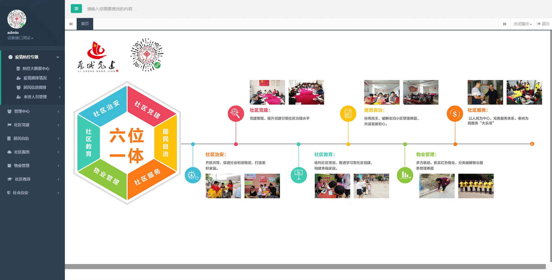 以党建、网格、综治、城管、政务、生活、物业、办公等为重点,提供社区党建、居民自治、社区服务、物业管理、社区教育、社会治安等各项工作大数据可视化展示,方便领导视察及街道治安整体管控,一目了然。